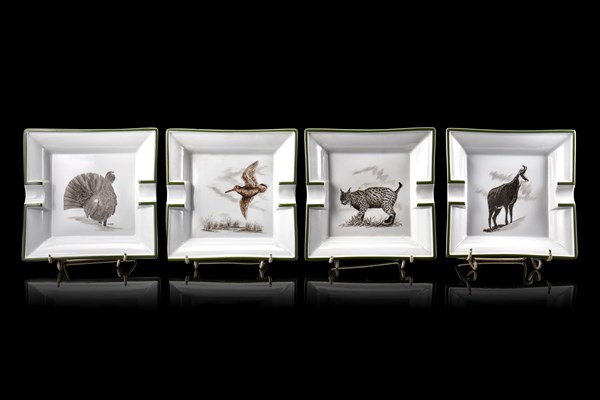Quattro posacenere in porcellana dipinta in policromia decorati da animali differenti (cm 18x18) (lievi difetti)