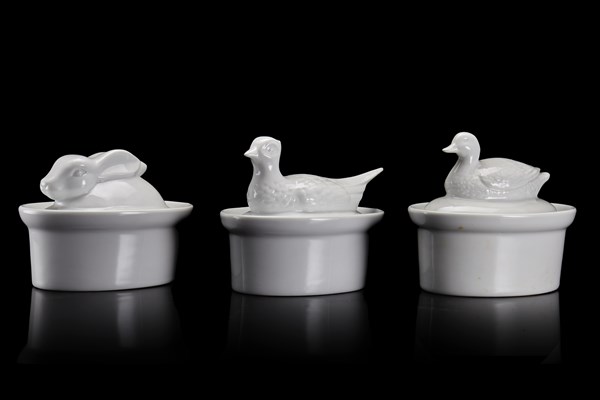 Gruppo di tre contenitori in porcellana bianca. Prese dei coperchi ad animali a tutto tondo (lievi difetti)