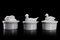 Gruppo di tre contenitori in porcellana bianca. Prese dei coperchi ad animali a