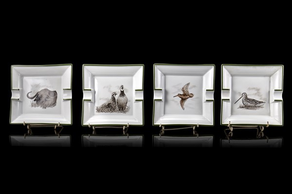 Quattro posacenere in porcellana dipinta in policromia decorati da animali differenti (cm 18x18) (difetti)
