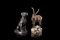 Scultura in resina raffigurante cane unita ad una in legno raffigurante stambec