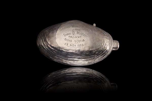 Fiasca in metallo argentato con dedica datata 28 novembre 1889. Stati Uniti. Ar