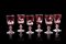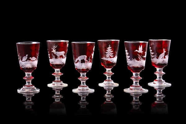 Manifattura di Boemia, inizio secolo XX. Gruppo di sei bicchierini da liquore in cristallo rosso decorati all'acido ad animali in paesaggio (difetti)