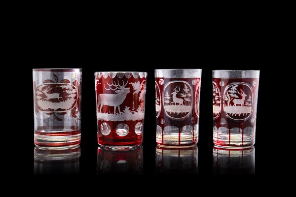 Manifattura di Boemia, fine secolo XIX. Gruppo di quattro bicchieri in vetro rosso incisi a stambecchi, cervi e animali (difetti)