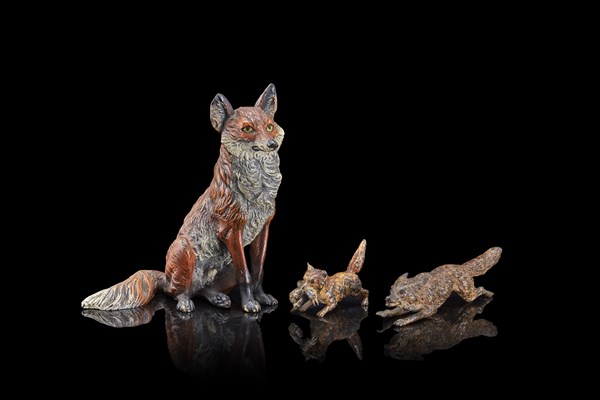 Manifattura austriaca, secolo XX "Volpi" tre sculture in bronzo decorate in policromia a freddo (h. max cm 13) (lievi difetti)