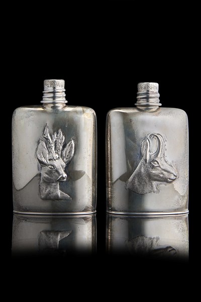 Due fiaschette in argento decorate con cervo e camoscio in rilievo. Titolo 800.
