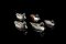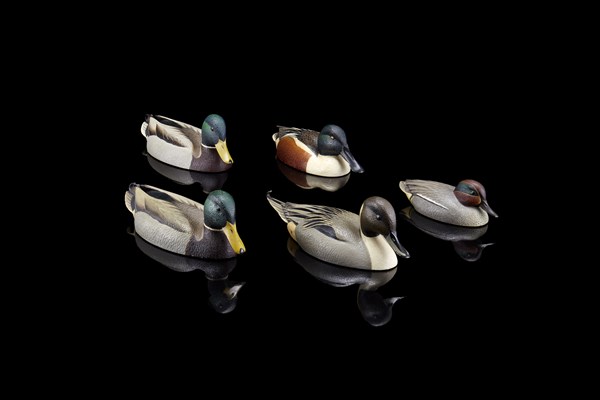Gruppo di cinque sculture decorate a smalti policromi raffiguranti diverse specie anitre di misure differenti. Val Benett, anni '90 ca. (lievi difetti)
