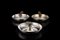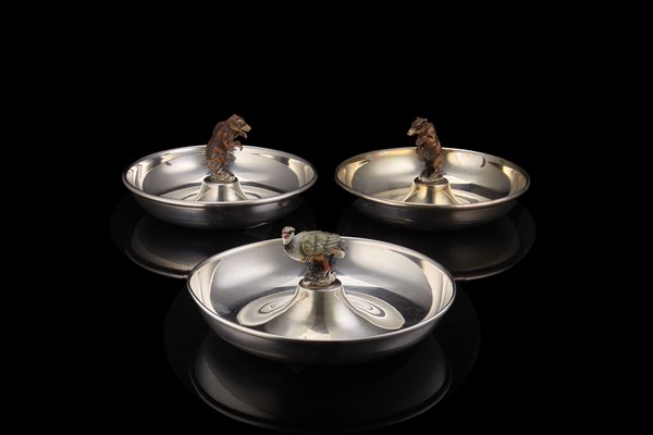Tre posacenere in argento sormontati da orsi e pernice smaltati a tutto tondo.