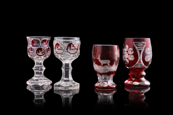 Manifattura di Boemia, fine secolo XIX. Gruppo di quattro calici in vetro incisi a stambecchi, cervi e animali vari (difetti)