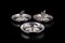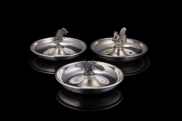 Tre posacenere in argento sormontati da volpe, orso e scoiattolo a tutto tondo. Titolo 800. Argentiere Miracoli (d. cm 13 ca.) (g 420) (lievi difetti)