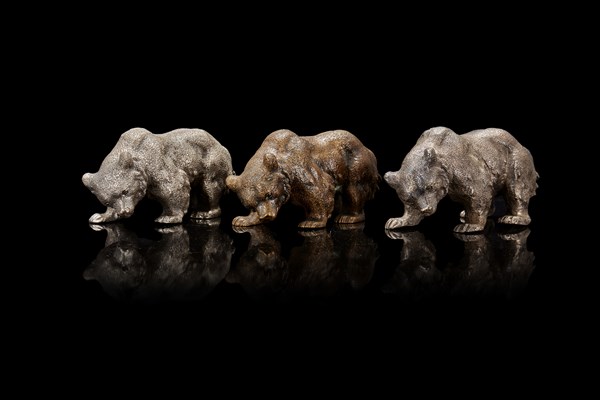 Gruppo di tre sculture raffiguranti orsi, di cui due in argento e una in bronzo