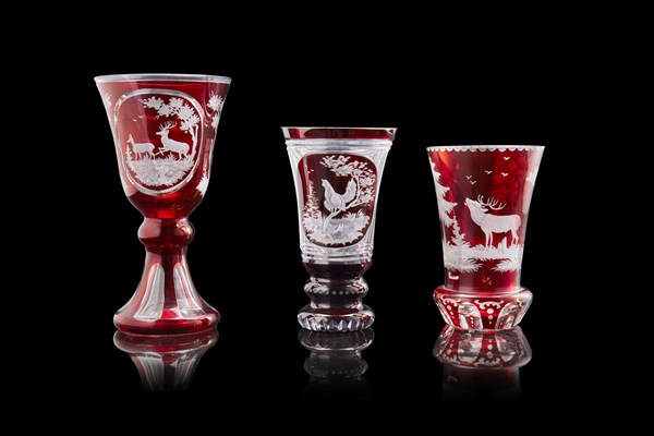 Manifattura di Boemia, fine secolo XIX. Gruppo di tre calici in vetro rosso incisi a stambecchi, cervi e animali vari (lievi difetti)