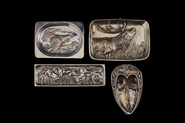 Quattro posacenere decorati con figure di animali differenti in rilievo. Tre in argento titolo 925 e uno in metallo argentato. Argentiere Miracoli (L. max cm 19) (g 1090) (lievi difetti)