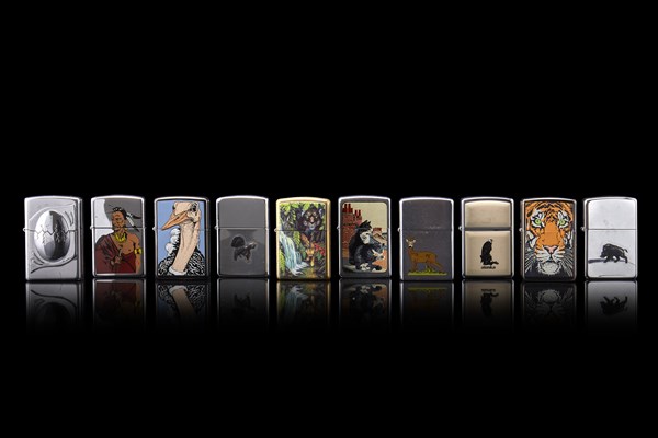 Ten zippo lighters decorated with figures and animals (minor defects)