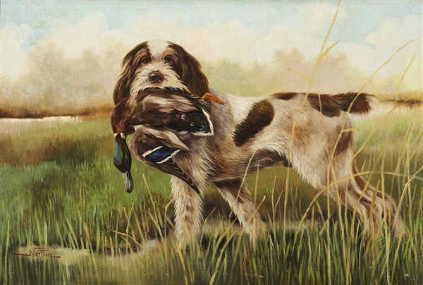 Mario Norfini "Bracco con anitra" olio su tela (cm 80x120) firmato in basso a s