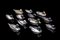Dodici sculture in argento e smalti in raffiguranti diverse specie di anitre di misure differenti. Titoli 800 e 925 (g lordi 1100) (lievi difetti)