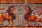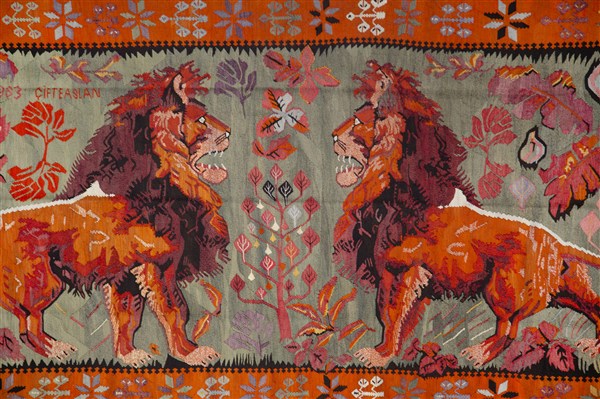 Tappeto Kilim Karabagh, Caucaso. Datato 1963 con iscrizione in lingua turca. Tessuto in lana su lana. Decoro con coppia di leoni contrapposti nei toni del marrone, beige, arancione e bianco su fondo color verde reseda. Al centro un albero della vita (cm 368x170) (lievi difetti)