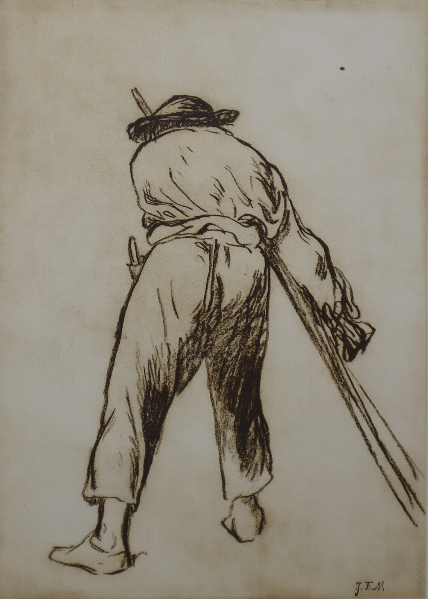 Uomo di spalle, XVIII secolo cm 25 x cm 16,5, in cornice cm 49 x cm 37 Stampa su carta Firmato in basso a destra .J.F.M