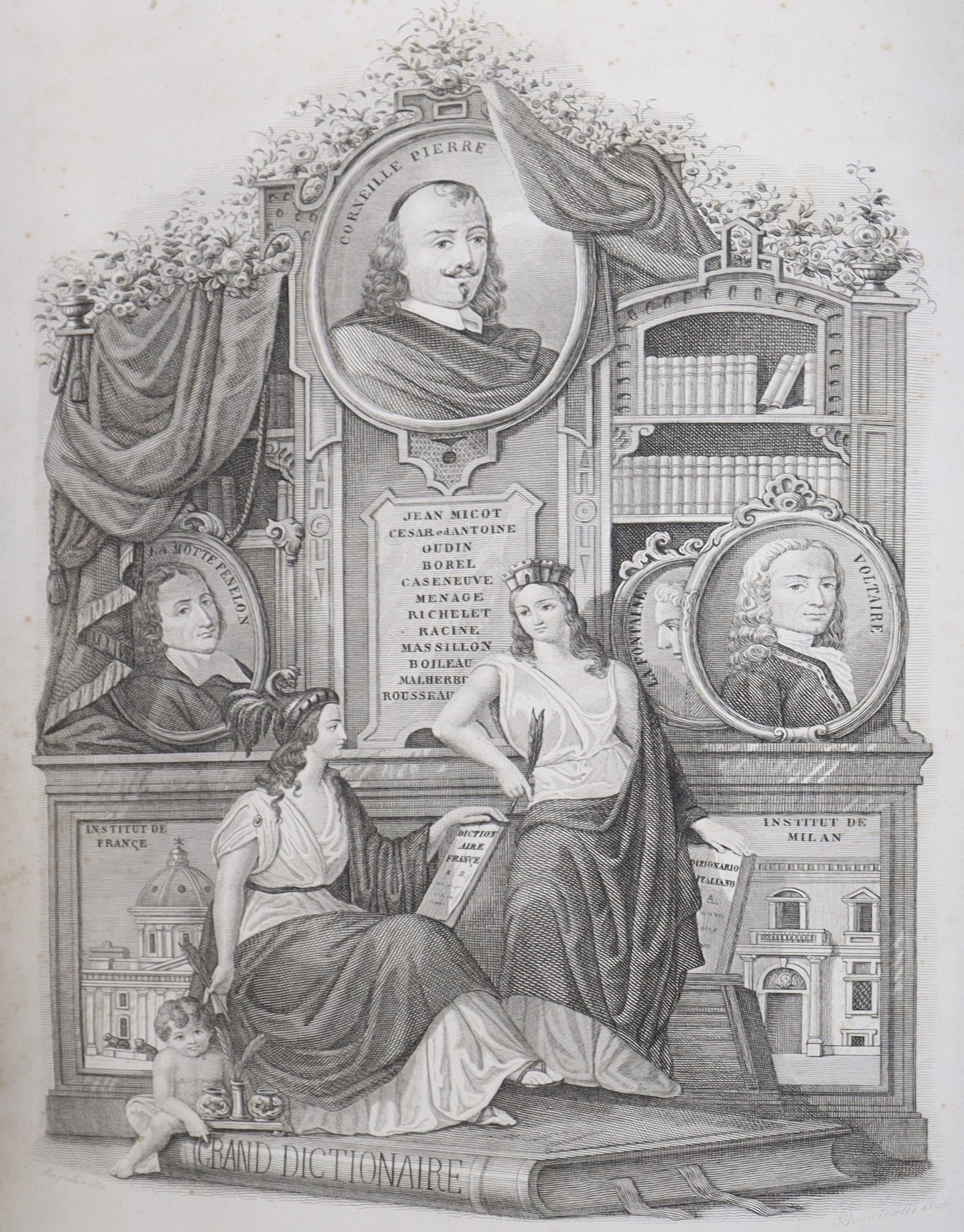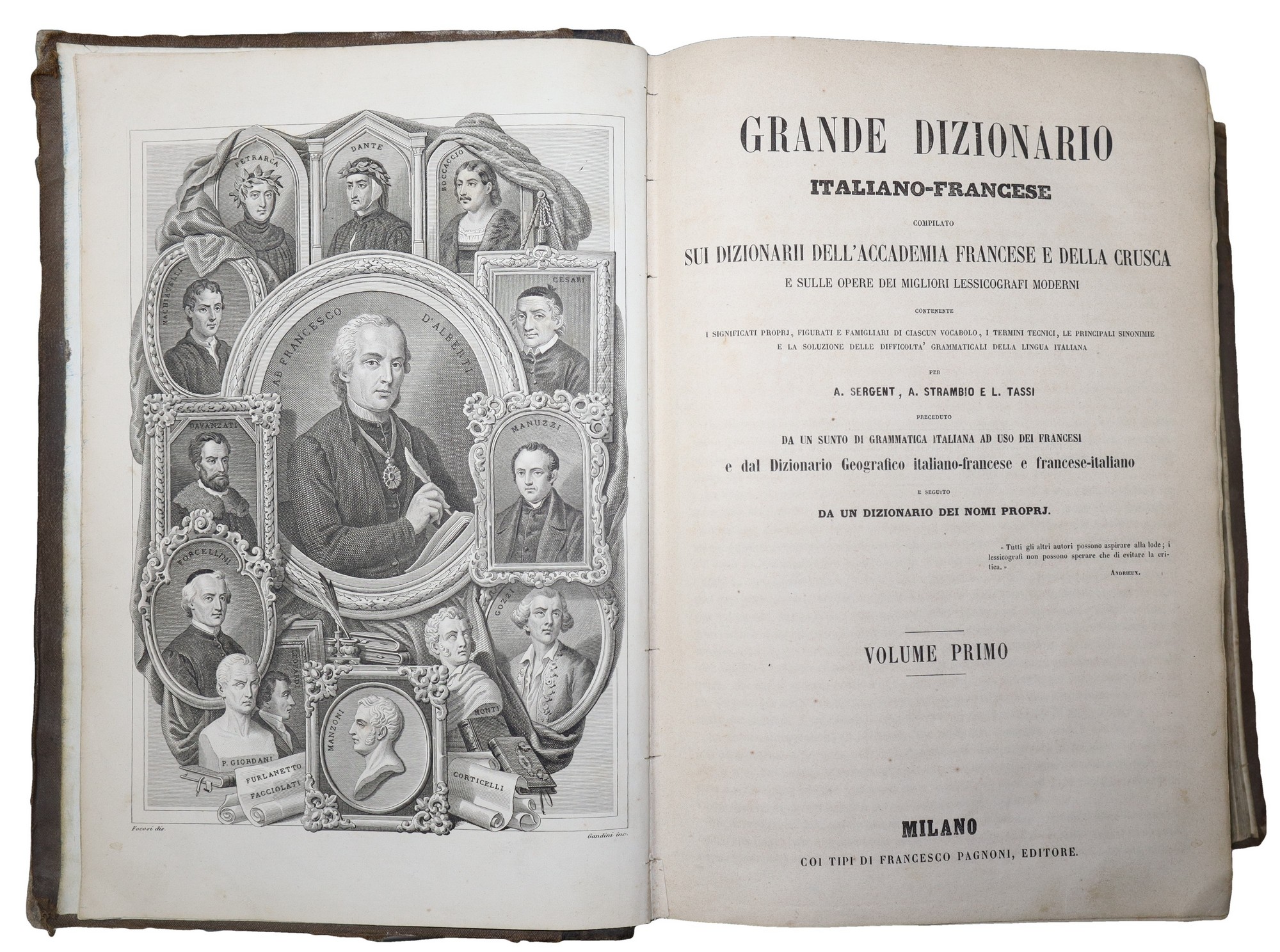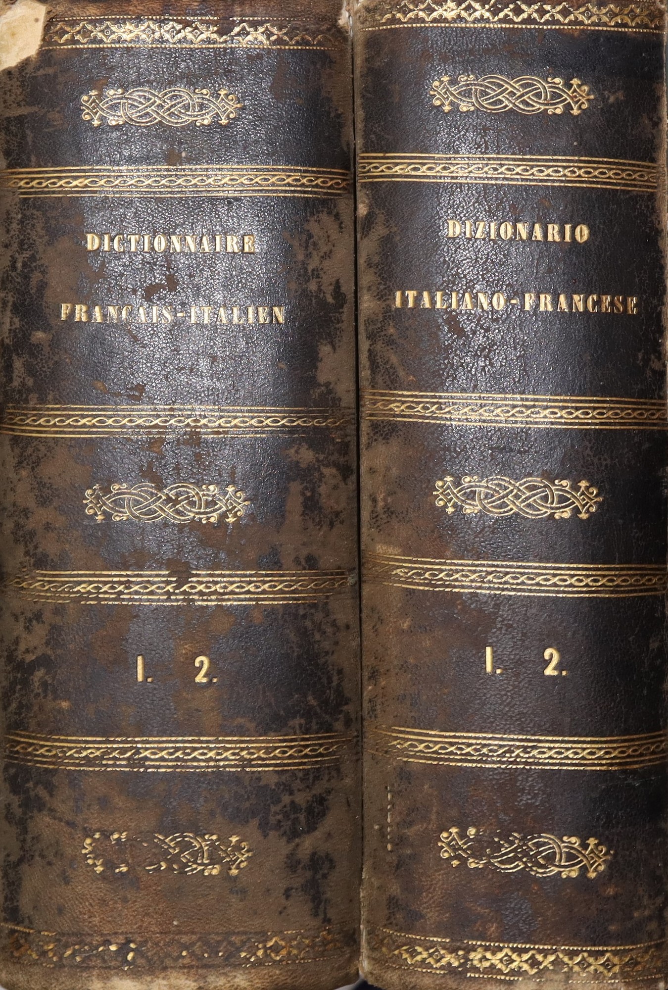 Grande dizionario italiano-francese e français-italien, 19°-20° secolo Sui dizionari dell'accademia francese e della crusca, Volume I in lingua italiana e in lingua francese, Milano, Francesco Pagnoni Editore. Presenti fioriture, opera incompleta