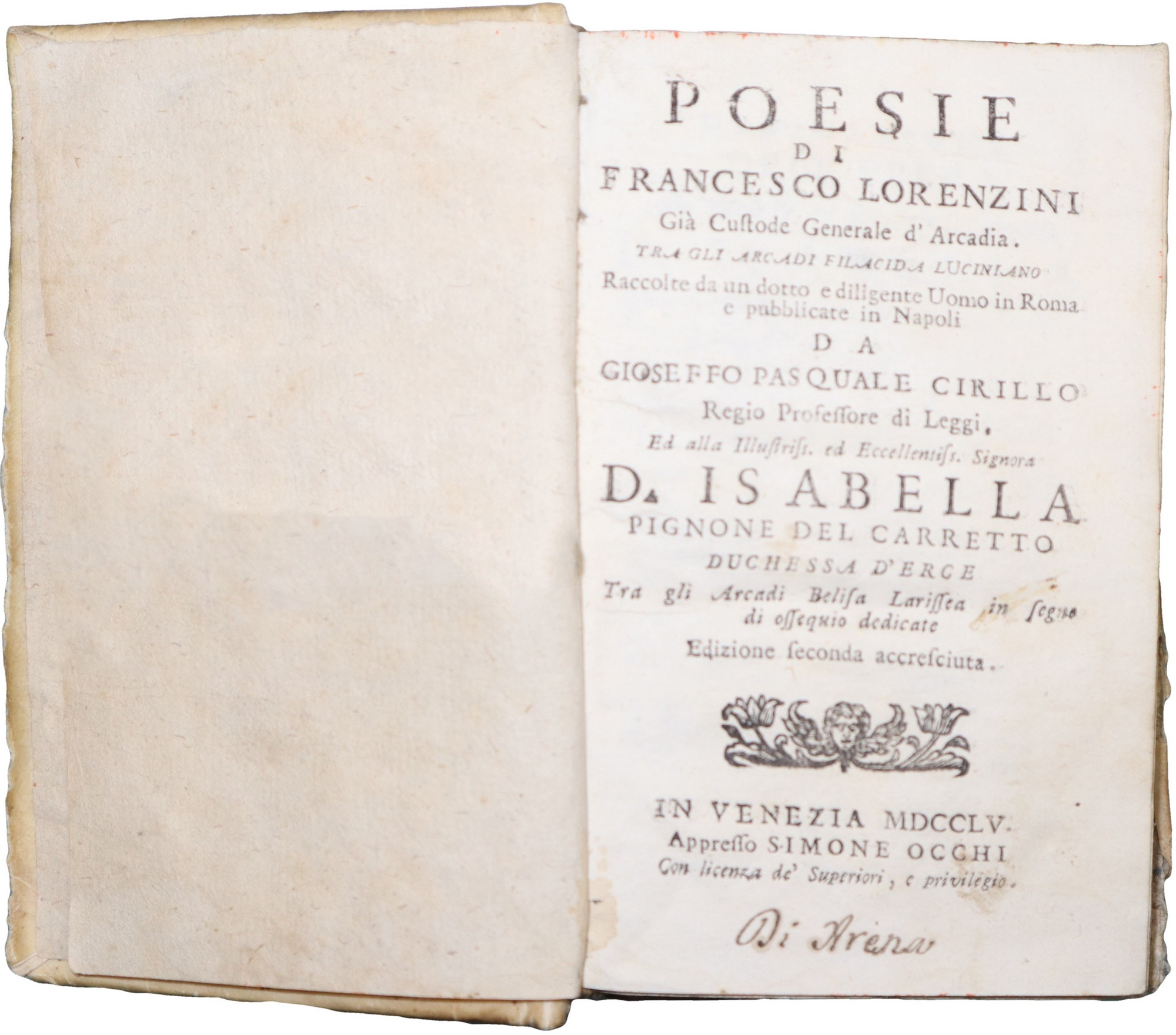 Francesco Maria Lorenzini (Roma 1680-Roma 1743) - Poesie di Francesco Lorenzini, 1755 Già custode generale d'Arcadia. Tra gli arcadi Filacida Luciniano. Simone Occhi, Venezia. Presenti sfilacciature e fioriture