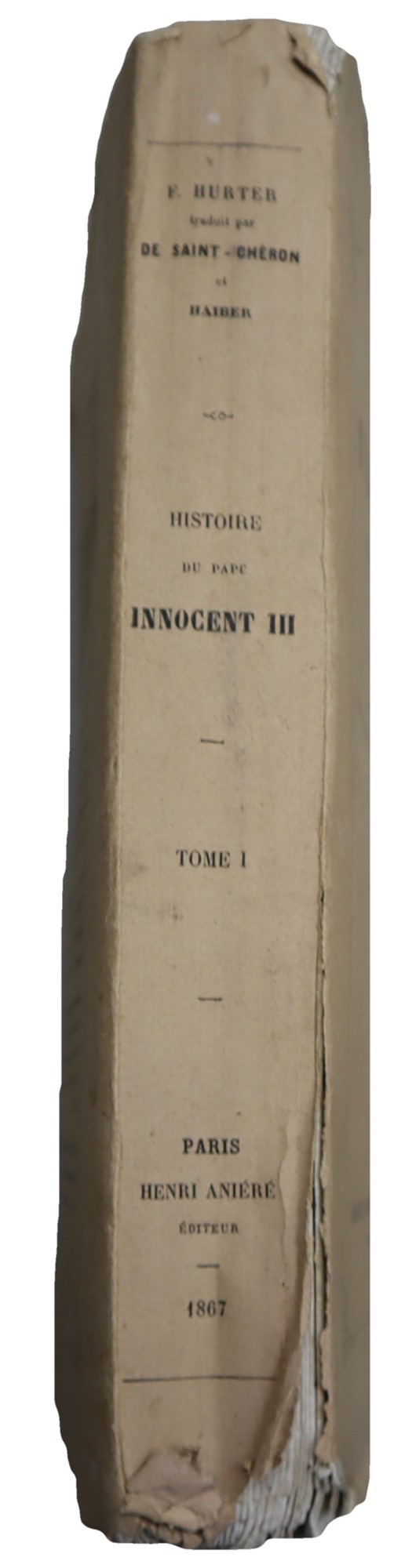 Friedrich Emanuel Von Hurter (1787-1865) - Histoire du Pape Innocent III et de ses contemporains, 1867 Tradotto dal tedesco da A. De Saint-Chéron e J.-B. Haiber. Seconda edizione, rivista e corretta, Tomo I. Parigi, Henri Aniéré libraio-editore. Presenti sfilacciature e fioriture