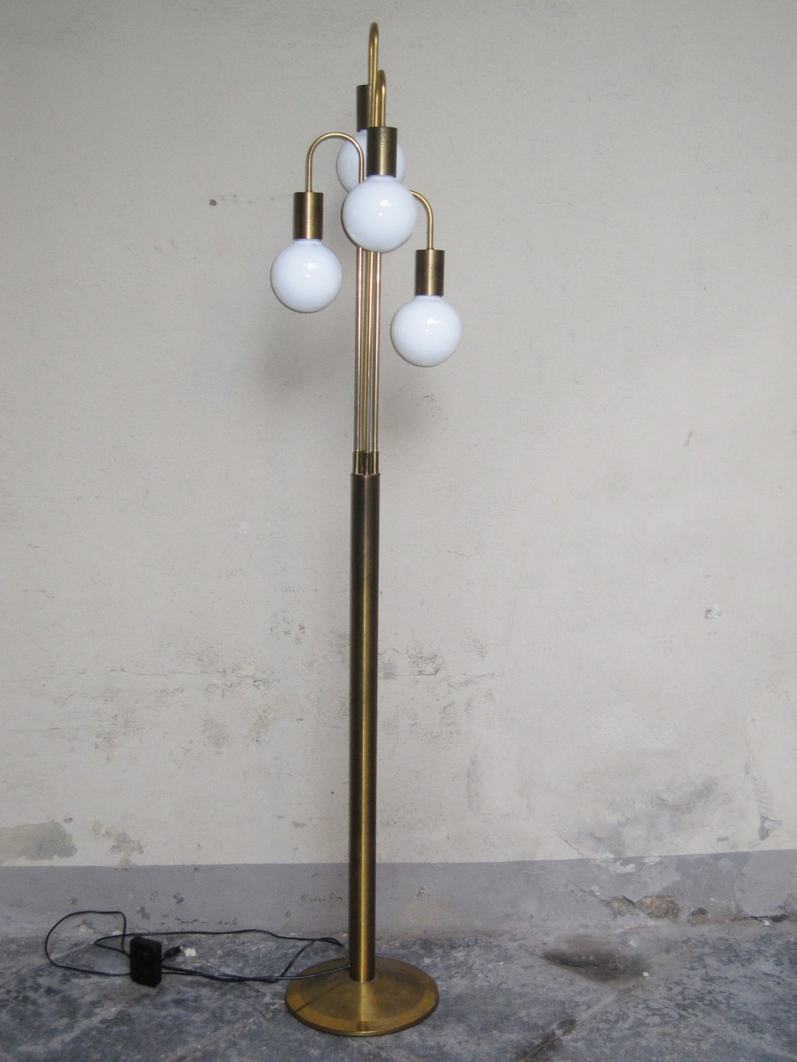 PRODUZIONE ITALIANA - ITALIAN WORK. Lampada da terra a quattro lampioncini degli anni 60. Floor lamp with four lanterns from the 60 ' s . Brass tubes and opal glass bulbs. Ottone e vetro. Cm 33x183.