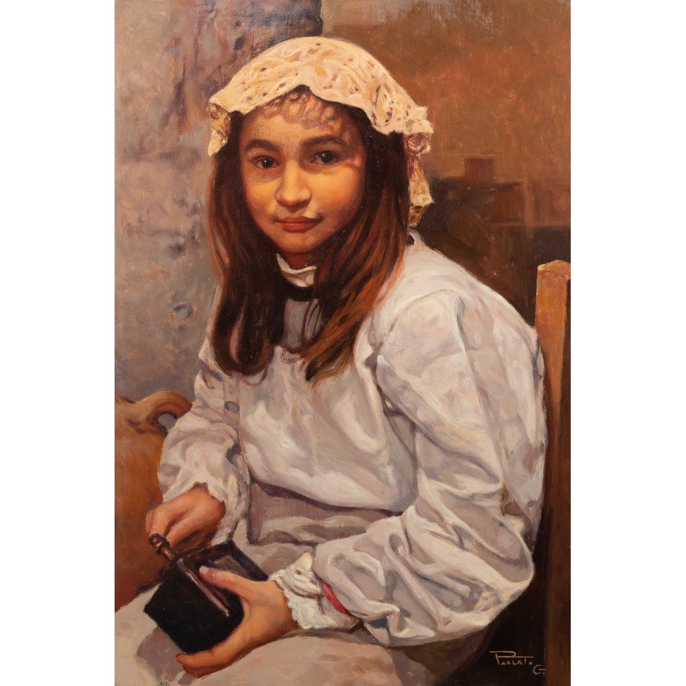 GIOVANNI PARLATO, Ragazza con macinino, Olio su faesite