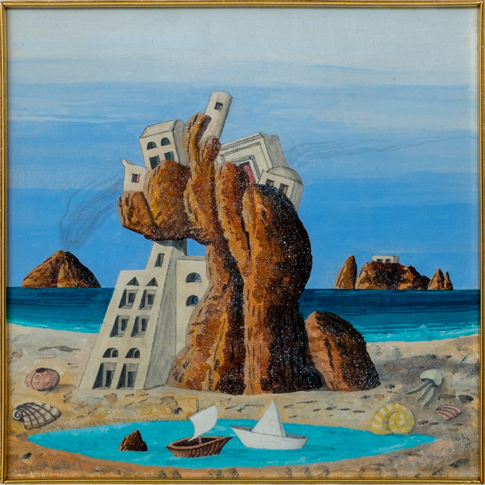 FABIO APHEL, Paesaggio con costruzioni, Olio su tavola