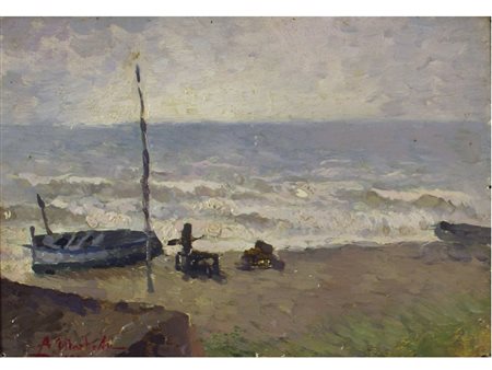 Angelo Mucchetti (1912-1960) Lago mosso con barca Olio su tavoletta Firmato Misure 23x32,8 cm