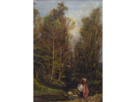 Antonio Pasinetti (Montichiari 1863-Milano 1940) Lavandaia al torrente Olio su tela Firmato Misure 67x45 cm