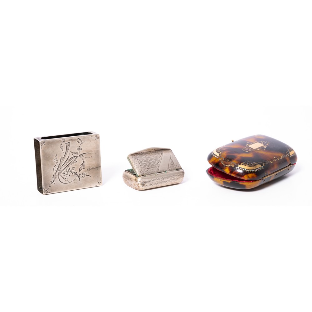 Portamonete in tartaruga con intarsi in oro basso titolo, tabacchiera in argento e un portafiammiferi in argento (usure).