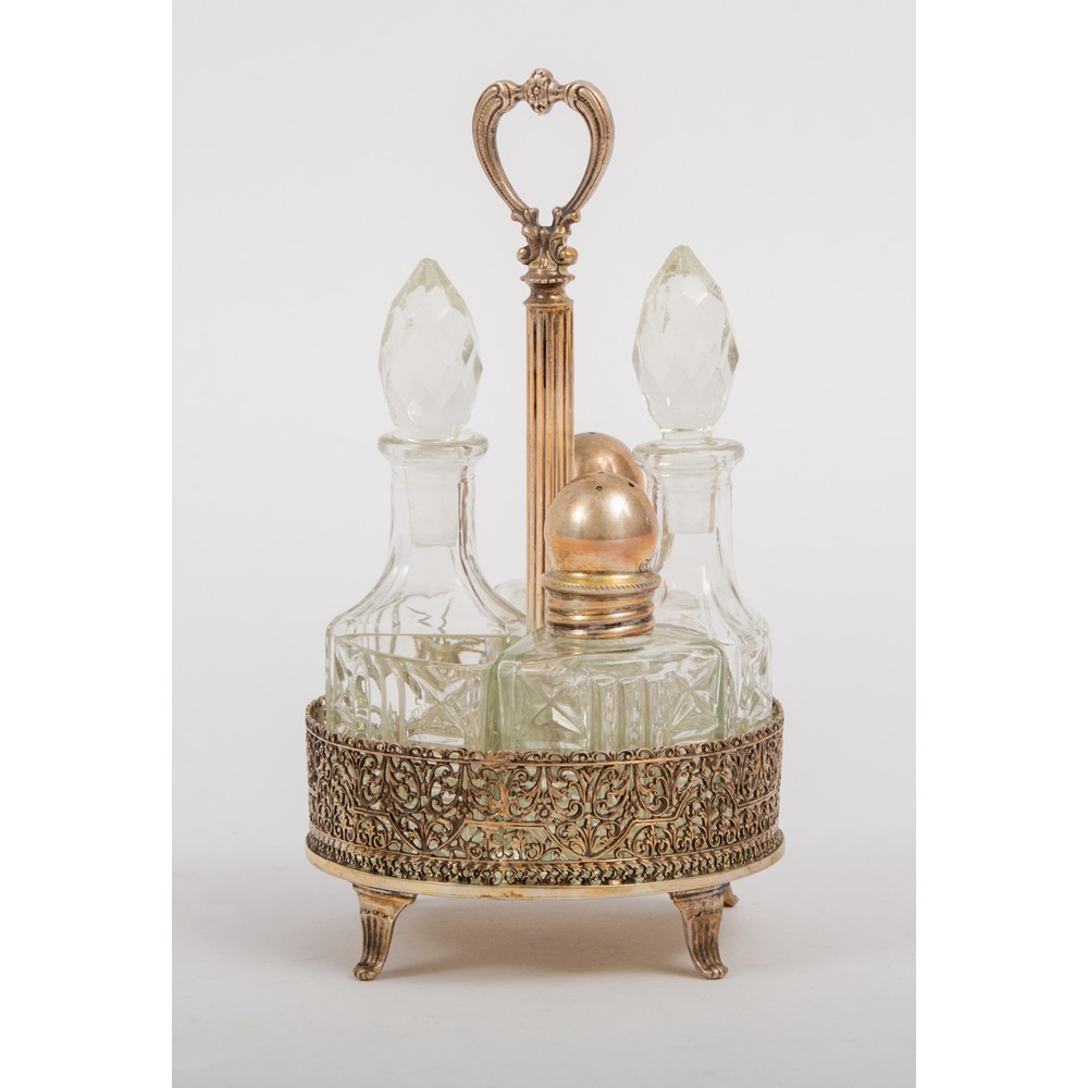 MENAGE in argento lavorato e traforato con ampolline in vetro. Argentiere Tadiello Gaetano - Milano (g. 230) (usure).