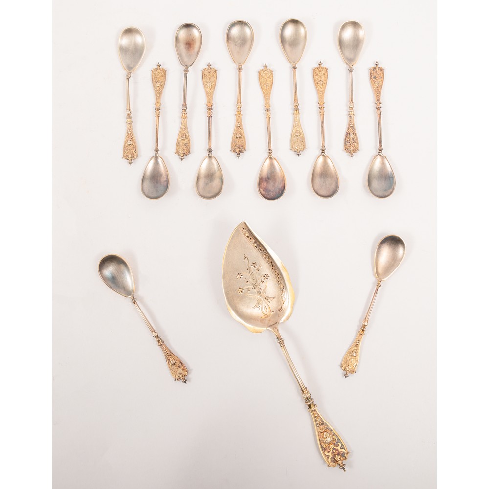 SERVIZIO DI POSATE da portata e 12 cucchiaini in argento 800 (g. 350).