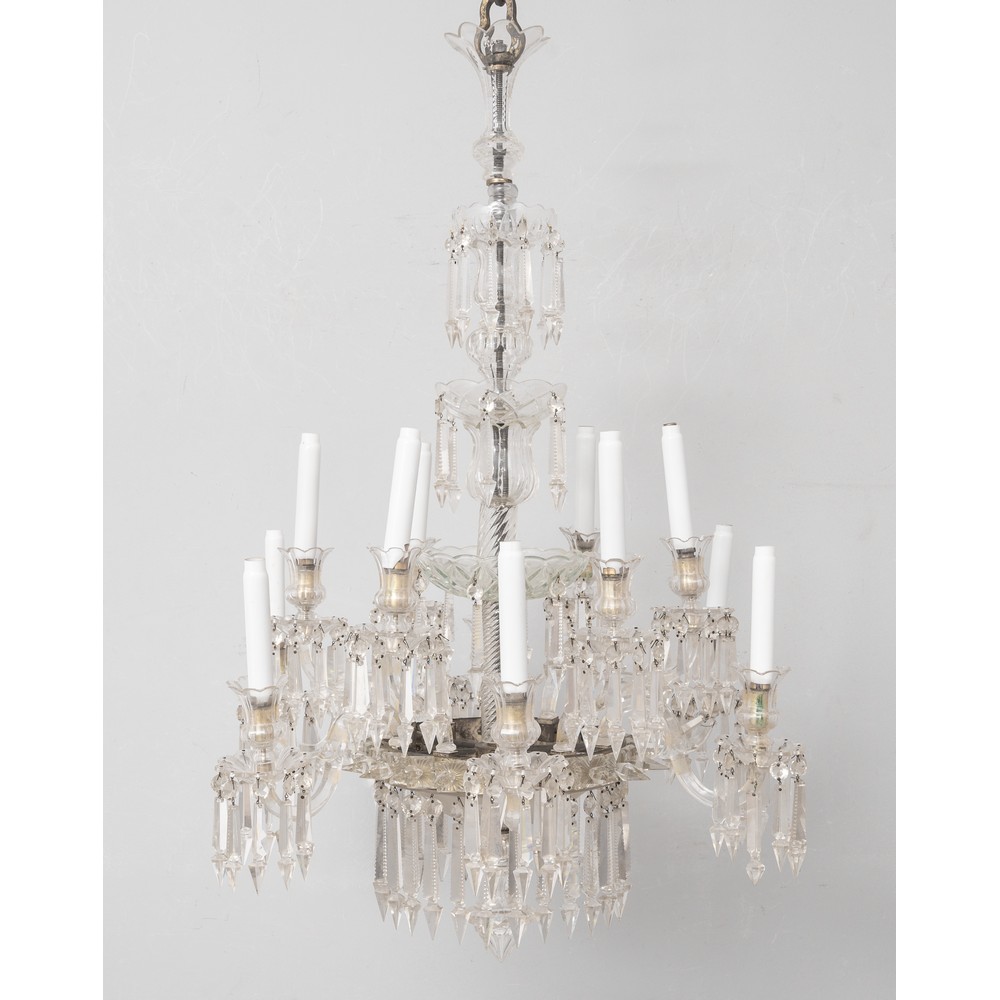 LAMPADARIO a tredici luci in vetro e pendenti.