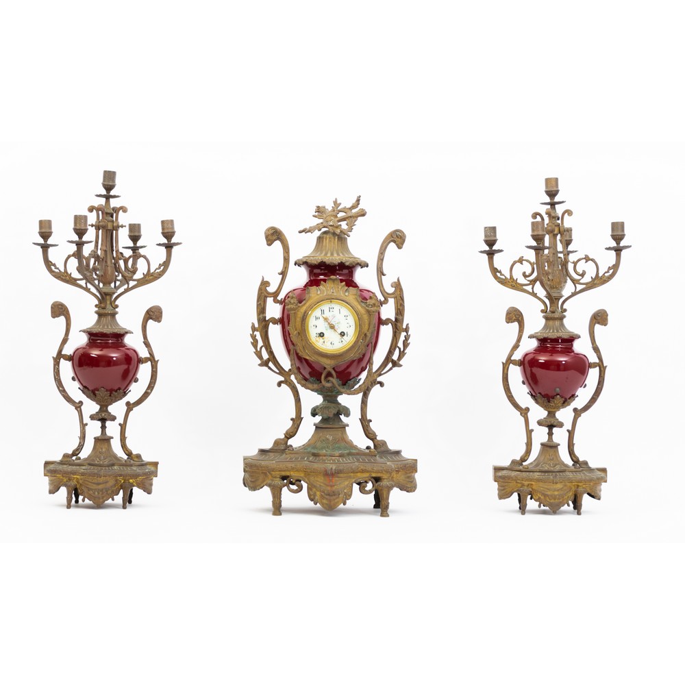 Trittico composto da orologio e da due candelabri in ceramica nei toni del bordeaux, basi ed elementi in antimonio dorato.
