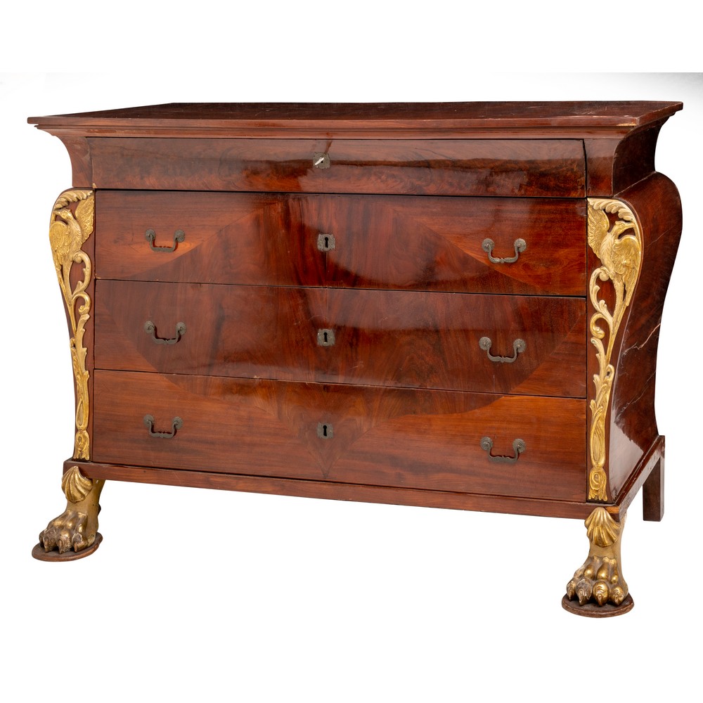 CASSETTONE Impero in mogano e piuma di mogano a quattro cassetti, piedi e fregi in legno dorato ad oro zecchino.
