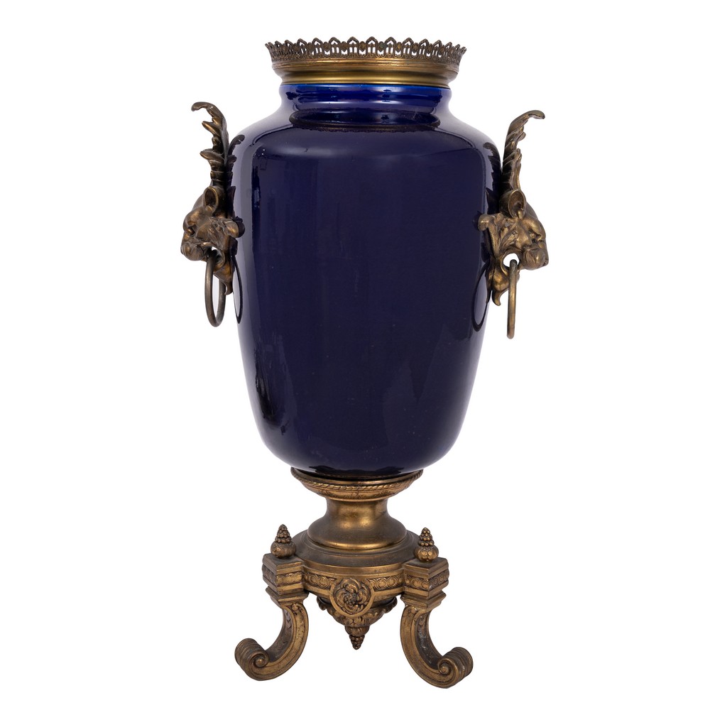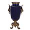 VASO in ceramica smaltata nei toni del blu cobalto con base e anse a guisa di leone in metallo dorato.
