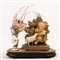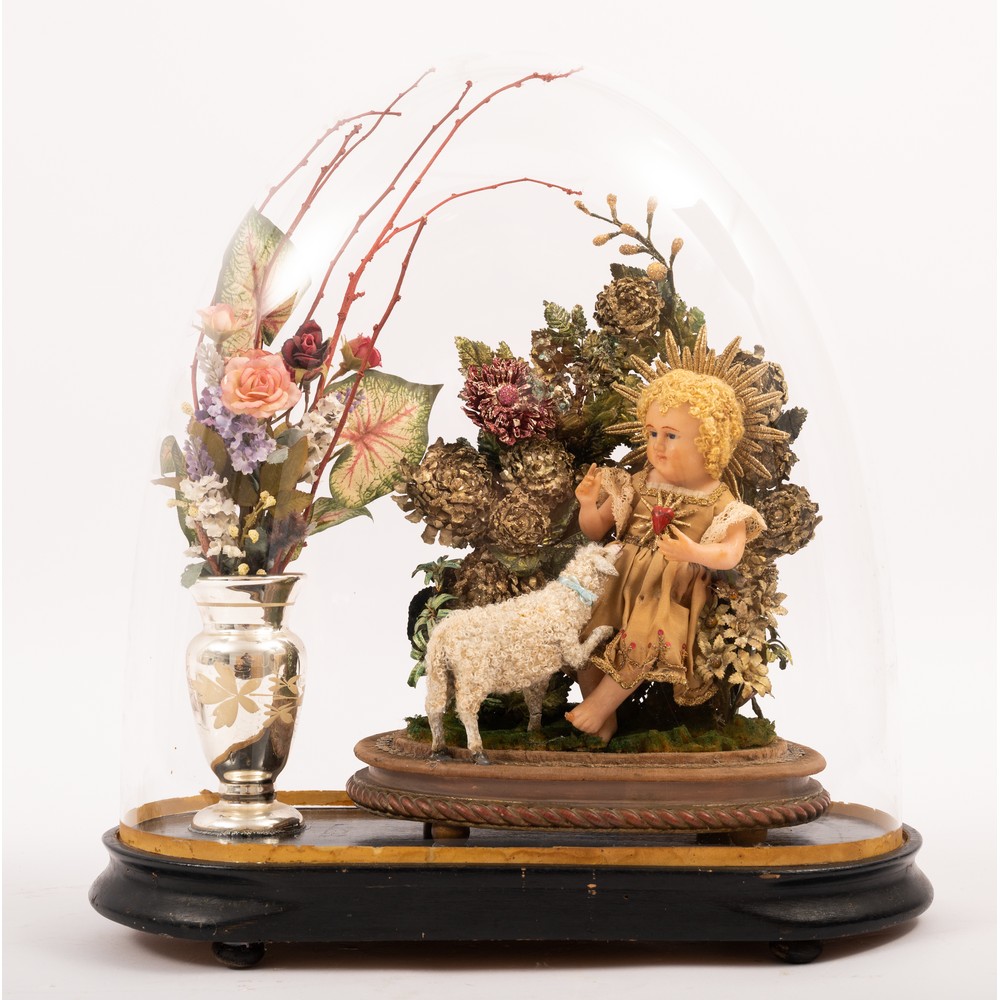 COMPOSIZIONE ENTRO CAMPANA in vetro con base in legno ebanizzato raffigurante Bambinello in ceroplastica con pecorella, guarnito con vaso in vetro dipinto con composizione floreale e fogliacea in tessuto e metallo.