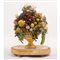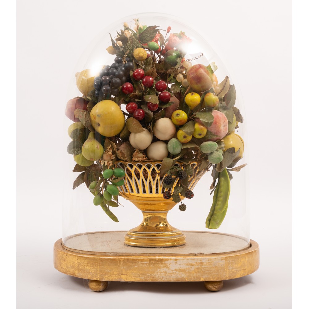 ALAZATA Impero in porcellana bianca dorata ad oro zecchino, con composizione di frutta e fiori in cera e tessuto, entro campana in vetro (rottura nella campana).