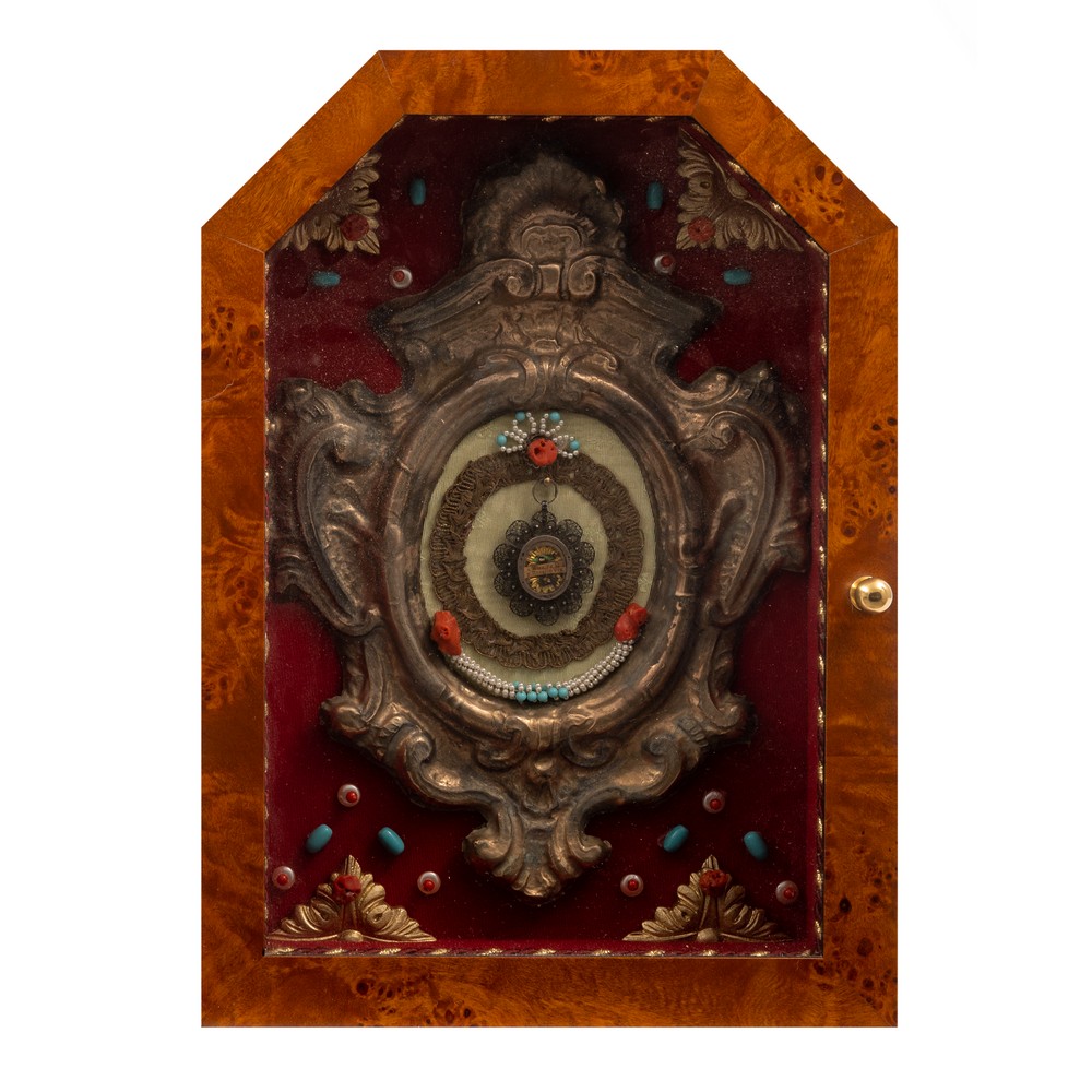 TECA contenente reliquia di Santa Rosalia in filigrana di argento entro cartagloria in metallo argentato ed applicazioni in corallo e pietre dure.