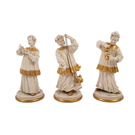 TRE SCULTURE in porcellana bianca Capodimonte in parte dorata raffigurante chierichetti, firmate alla base.