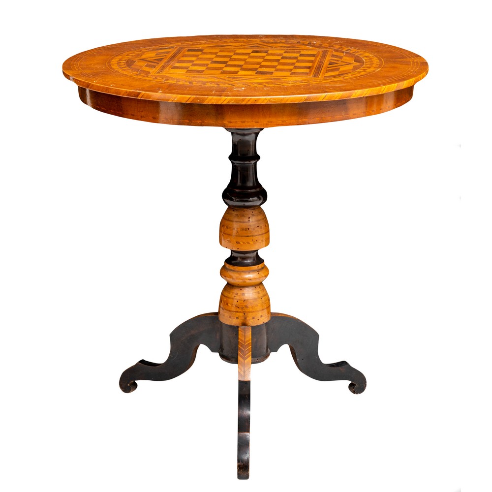 TAVOLINO SORRENTINO di forma circolare in legno di noce e varie essenze di legno con piano a scacchiera.