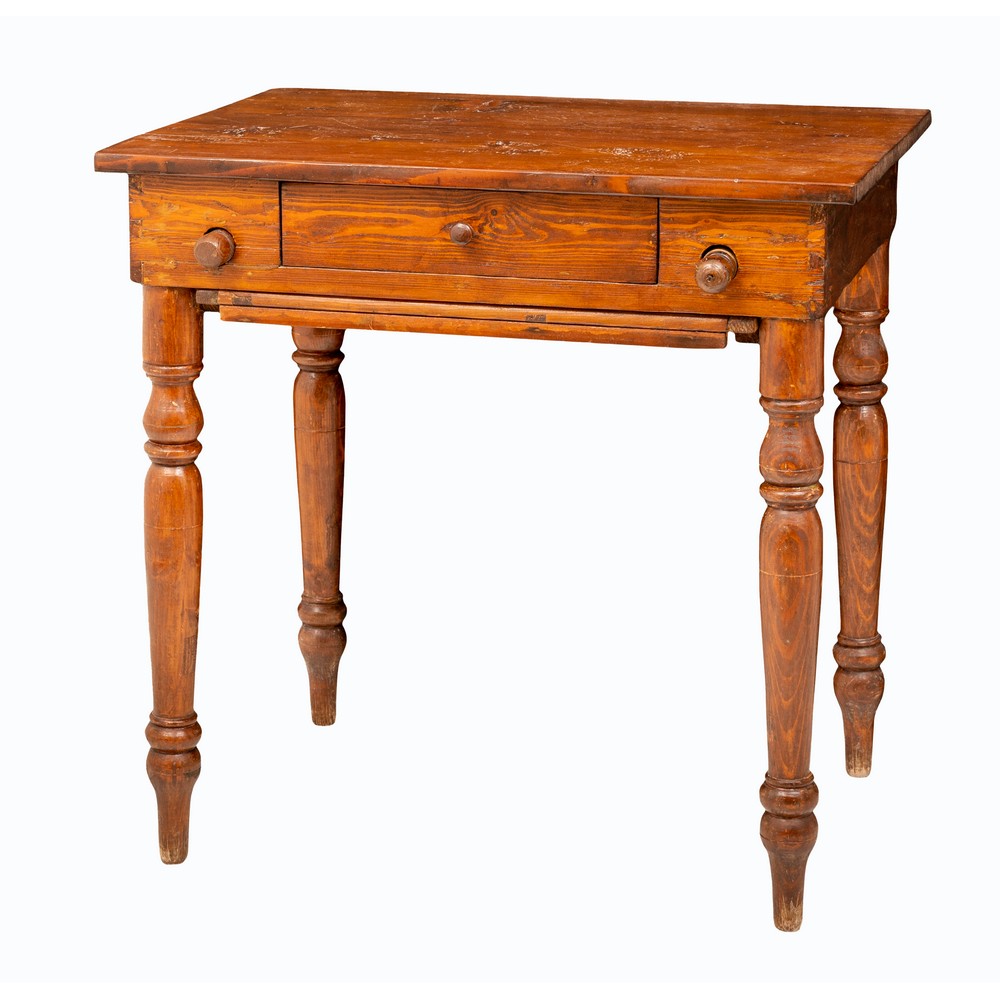 TAVOLINO DA CUCINA in legno di abete, a quattro piedi con cassetto e mattarelli, tiretto centrale.