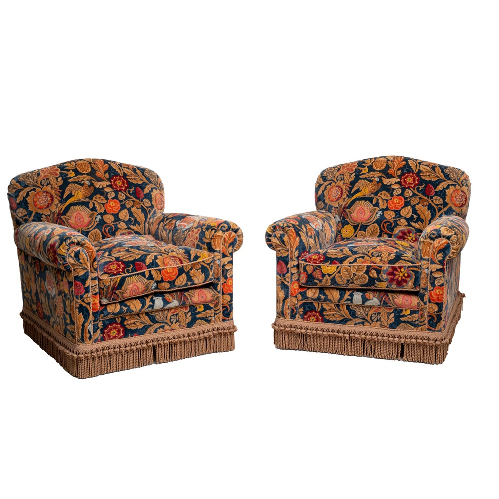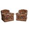 COPPIA DI POLTRONE con struttura in legno con tappezzeria a motivo floreale e fogliaceo.