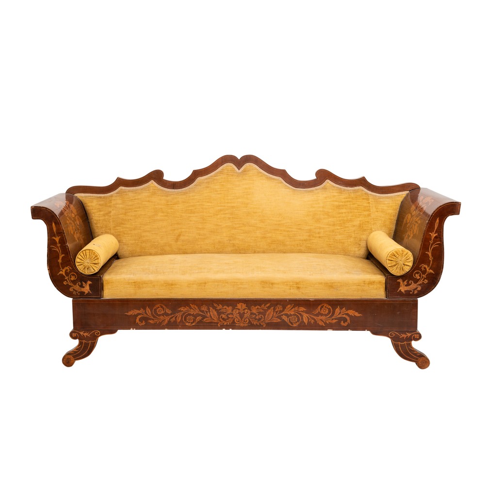 DIVANO a barca stile Carlo X in mogano con tarsie e perfili in bosso.