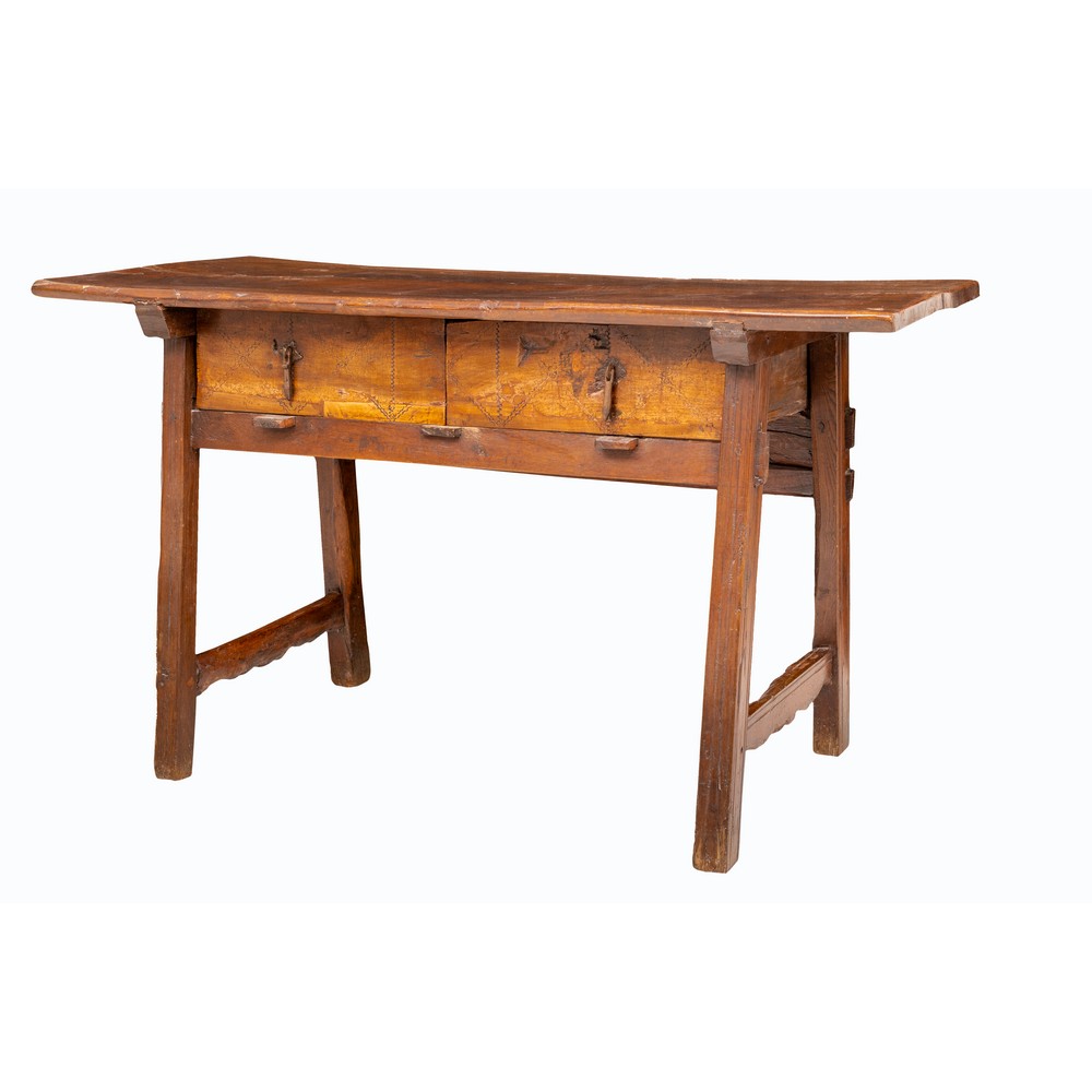 TAVOLO CAPRETTA in legno di noce con due cassetti.