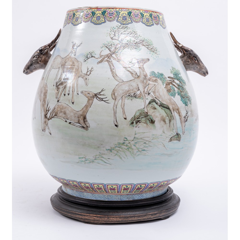 VASO in porcellana decorata a mano con base in legno (usure e piccole mancanze).