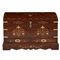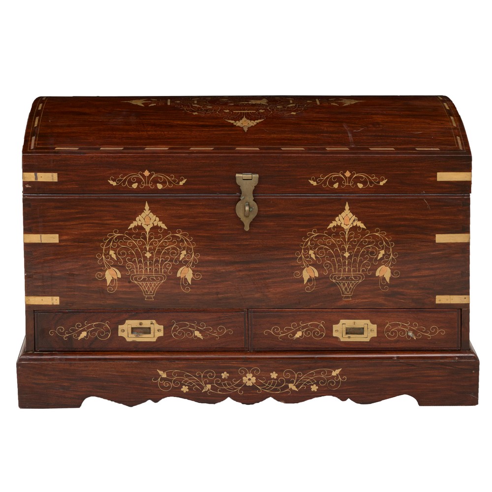 BAULE in legno di mogano con inserti e tarsie in rame.