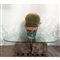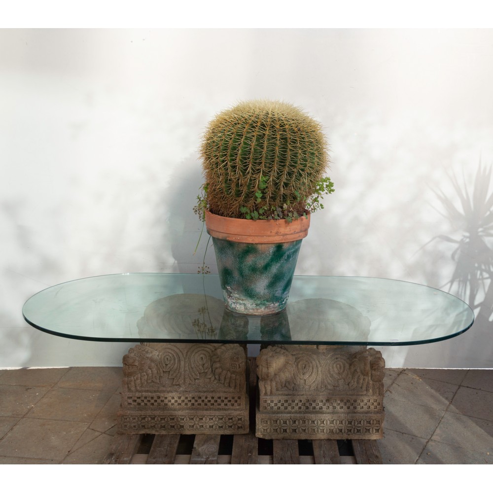TAVOLO DA SALOTTO con due capitelli in pietra di gusto orientale e piano in vetro.