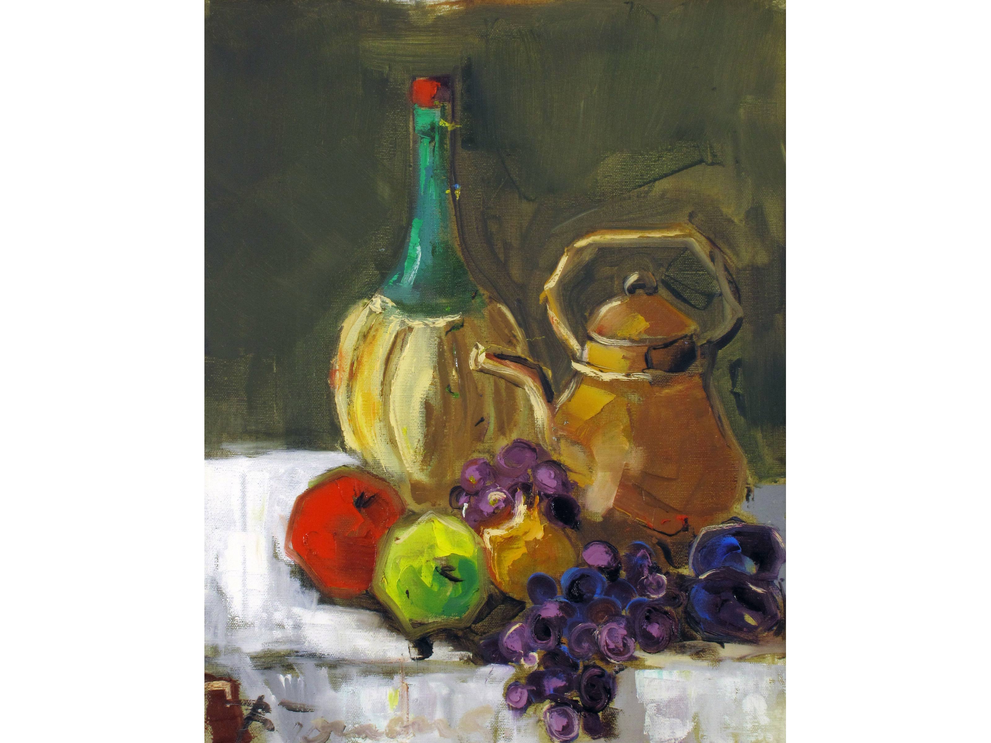 Benito Tomezzoli (Verona 1923) Natura morta con fiaschetto di vino Olio su tela Firmato Misure 49x39 cm